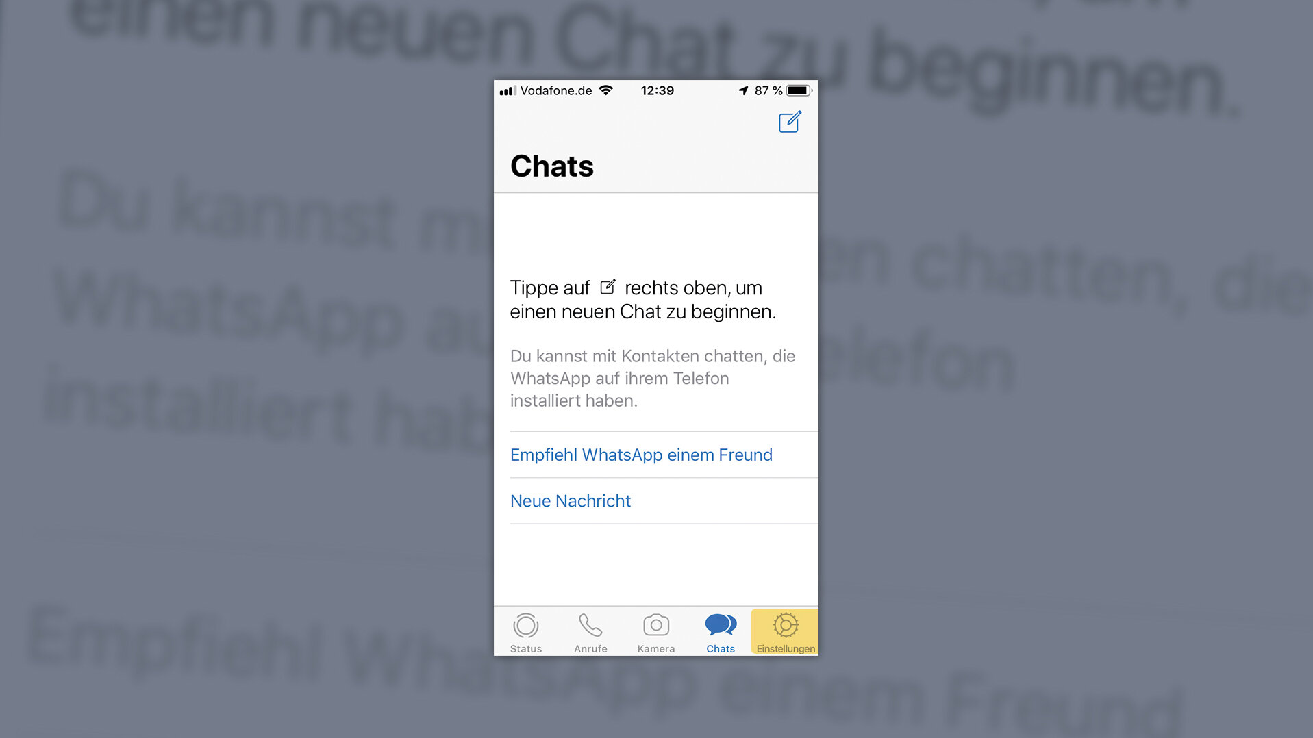Um einen neuen Chat zu beginnen, Tippen Sie oben rechts auf das Symbol mit dem Zettel und den kleinen Stift. Um zurück in die Einstellungen zu kommen, wählen Sie unten rechts „Einstellungen“.